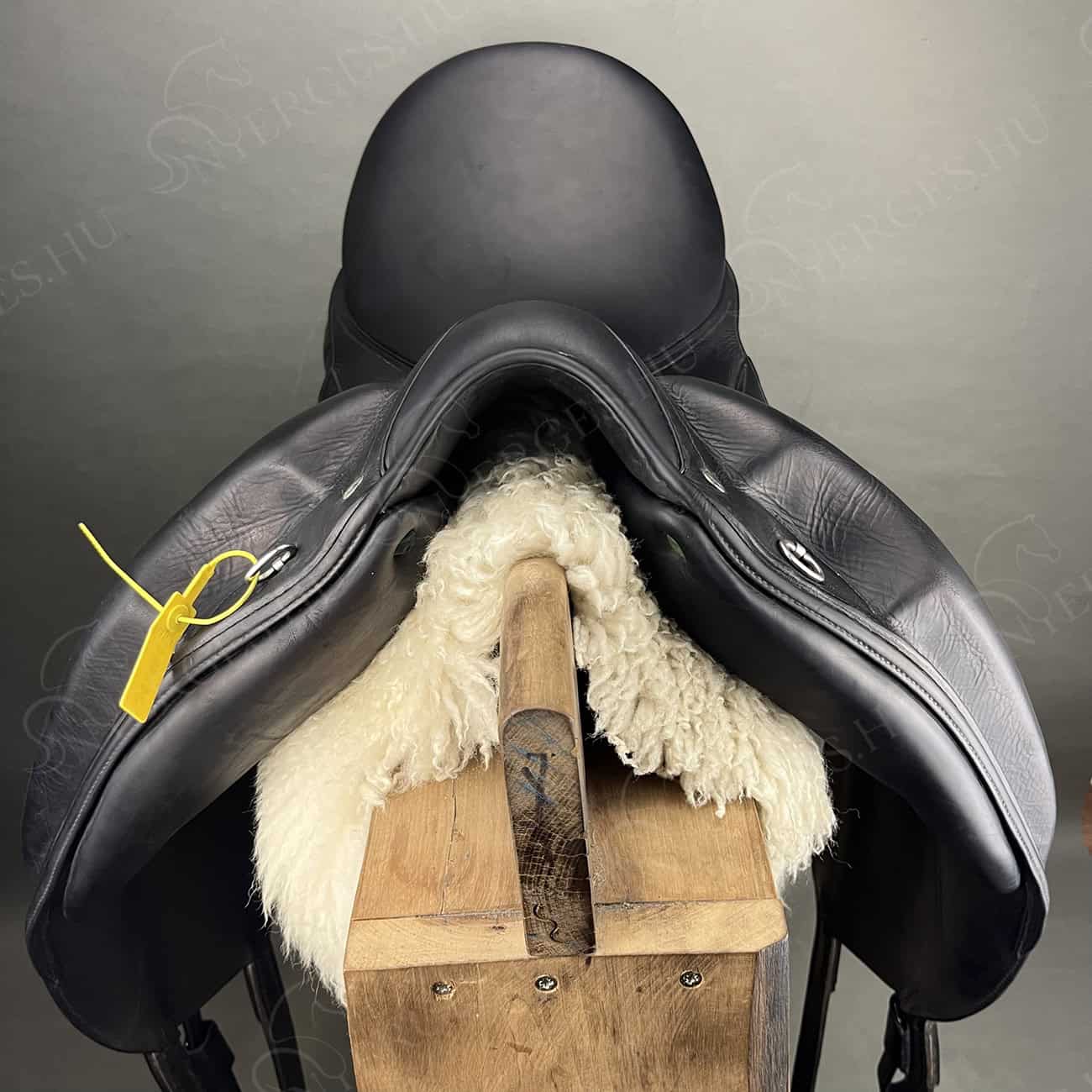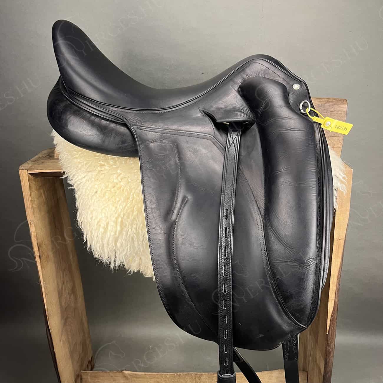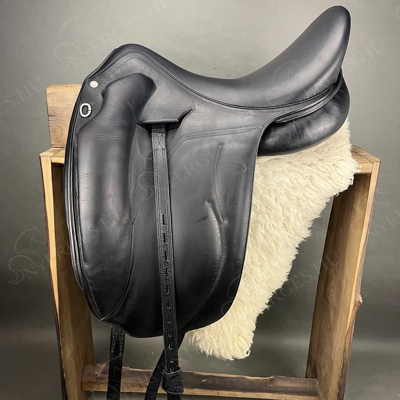 Gyönyörű állapotú, igazán népszerű és felsőkategóriás francia díjlovasnyereg. Monoszárnyas kialakítás, nagy combtámasszal, mély ültetéssel, tapadós, minőségi bőrből. Beleírt méret 18, azonban a francia nyergek jellemzően kisebbek, így 17’5-s méretre ajánlom inkább.  A nyereg tulajdonságai: